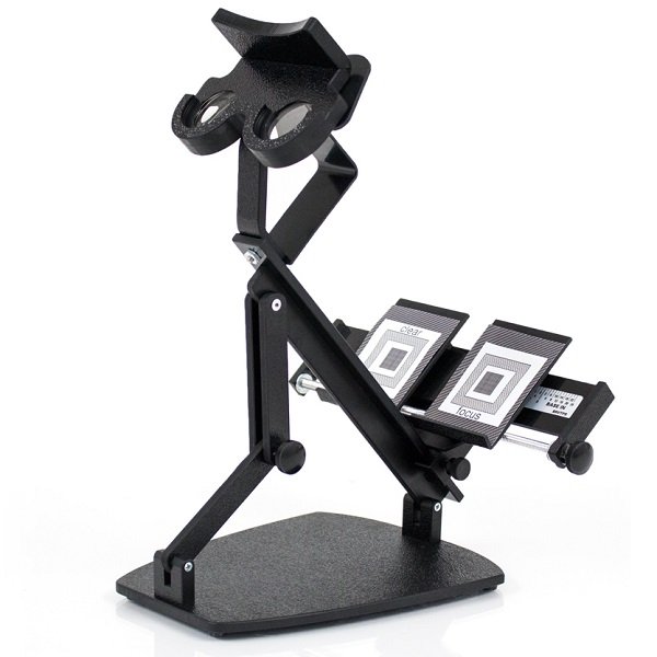 A professional instrument for variable orthoptic training. Matched left/right card sets are placed in appropriate guides and separated or integrated with the precision thumbscrew adjustment creating either a Base-In or Base-Out demand. High impact ABS plastic in neutral gray color for minimal background awareness.
