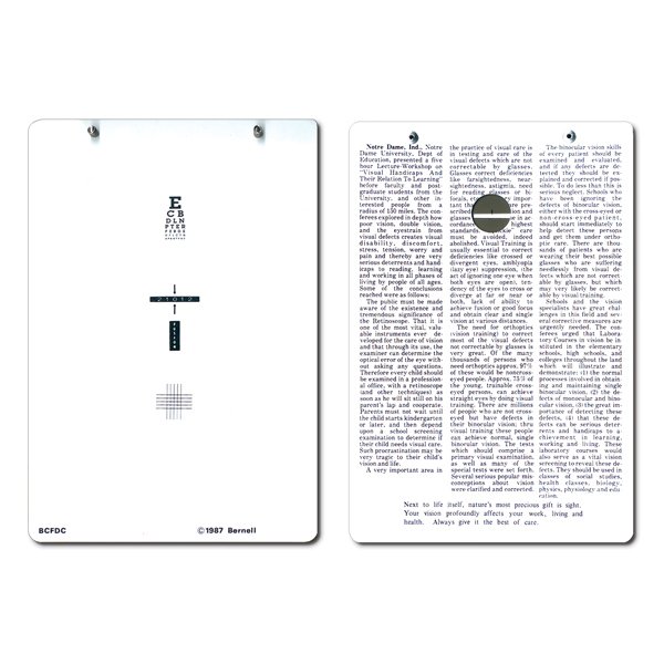 Variable slide adjust to determine fixation disparity or may be used with hand held prisms. Designed for phoroptor use. The card comes with a label which may be placed over the prism diopter scale for an additional scale in degrees. Reverse side of card includes reduced Snellen, fusional target and cross cylinder targets. 5-1/2″ x 8″ card and polarized goggle.