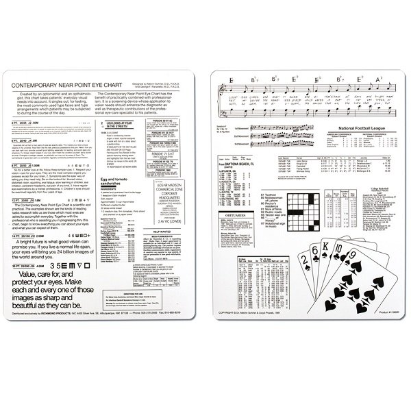 This sturdy 8.5″ x 11″ chart was created by an MD and OD to show most common task using your eyes. It can be used to screen for visual difficulties as well as demonstrate needs. Good for use in the exam room as well as the workup and dispensing rooms.