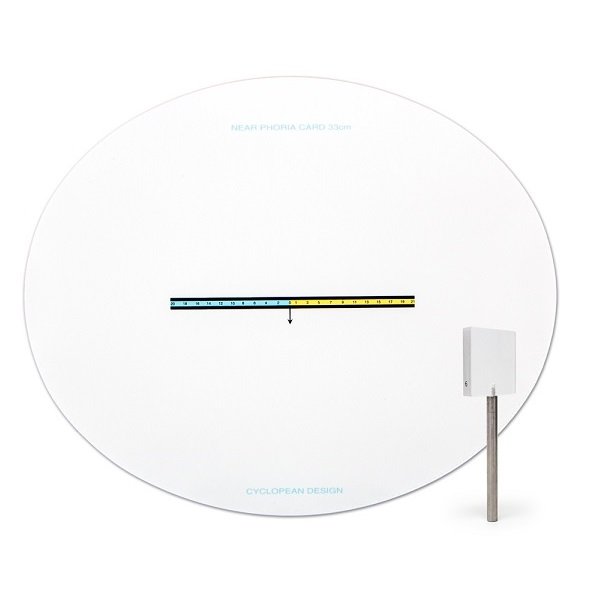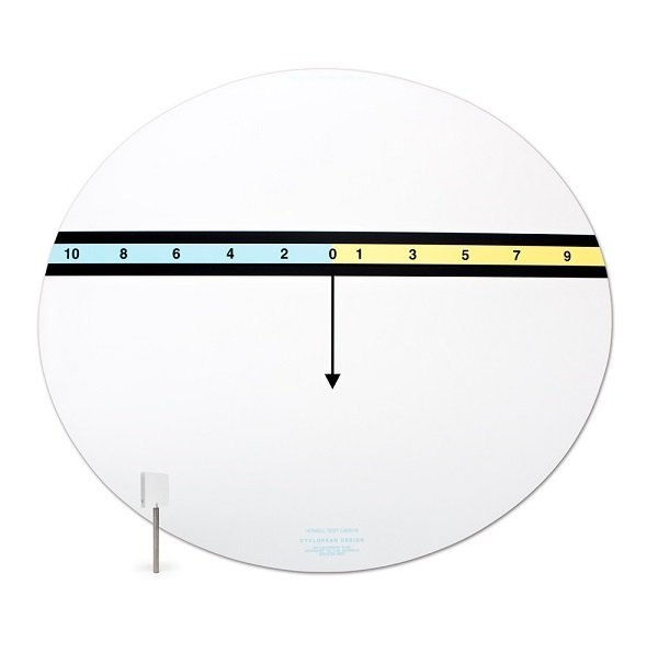 These cards allow direct measurement of the distance and near phorias in real space or with a phorpter. The patient simple has to tell which number the arrow points to. Any odd number (in yellow) shows esophoria while the even numbers (in blue) shows exophoria. An AC/A can quickly be determined with trial lenses.