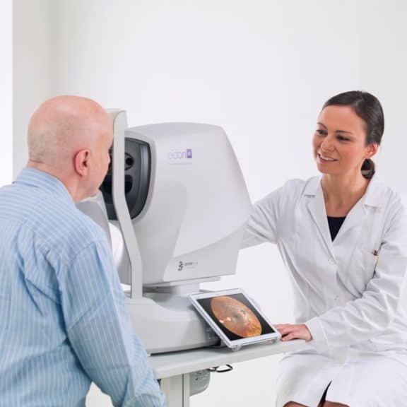 The quick examination time makes it an easy, and comfortable experience for patients. The non-invasive Fundus Autofluorescence (FAF) imaging technique used in the iCare EIDON AF retinal imager uses a single flash of light which ensures maximum patient comfort. The images can be captured even in a pupil as small as 2.5 mm, making it possible to obtain high-quality images without dilation.