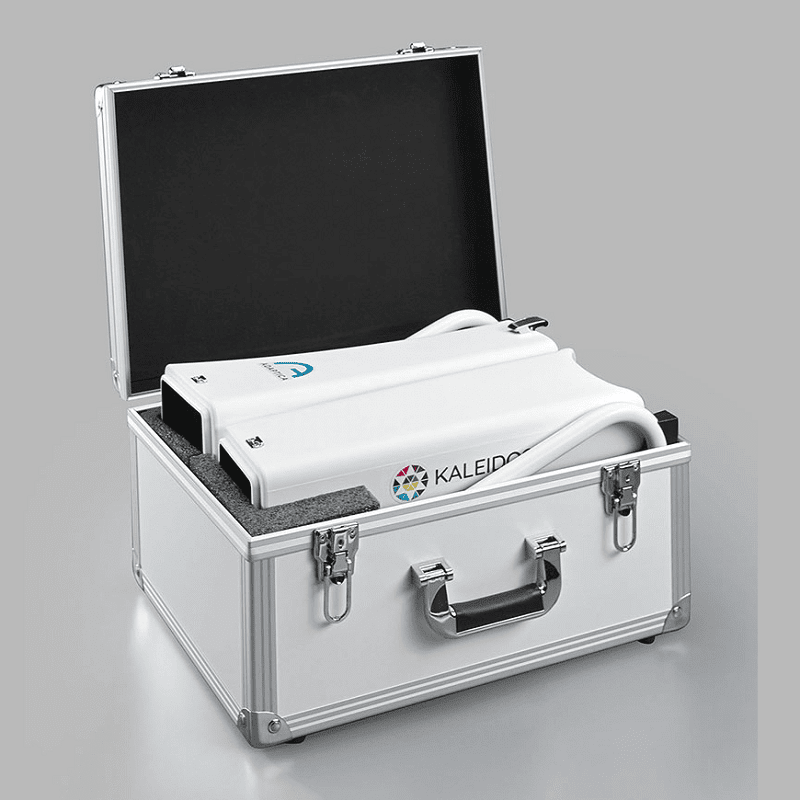 The Kaleidos is a binocular mobile refractometer and vision analyzer that measures the refraction of both eyes and discovers other ocular impairments. The device serves as a darkroom and allows the exam to be performed in any light condition: while the patient looks inside of it, the system automatically detects refractive errors in less than three seconds. The Kaleidos measures objective refraction in the range of -15D to +15D, and phorias/tropias in prismatic diopters, as well as other additional features.