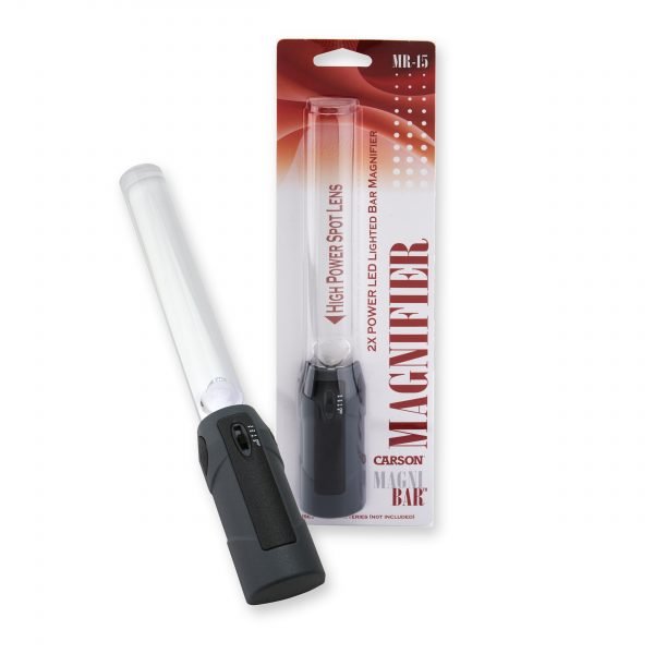Carson’s MagniBar™ is a 2x bar magnifier with a spot lens that magnifies up to 12x. The dual LED lights feature 3 brightness settings. Great for small print reading such as newspapers, magazines and directories.
